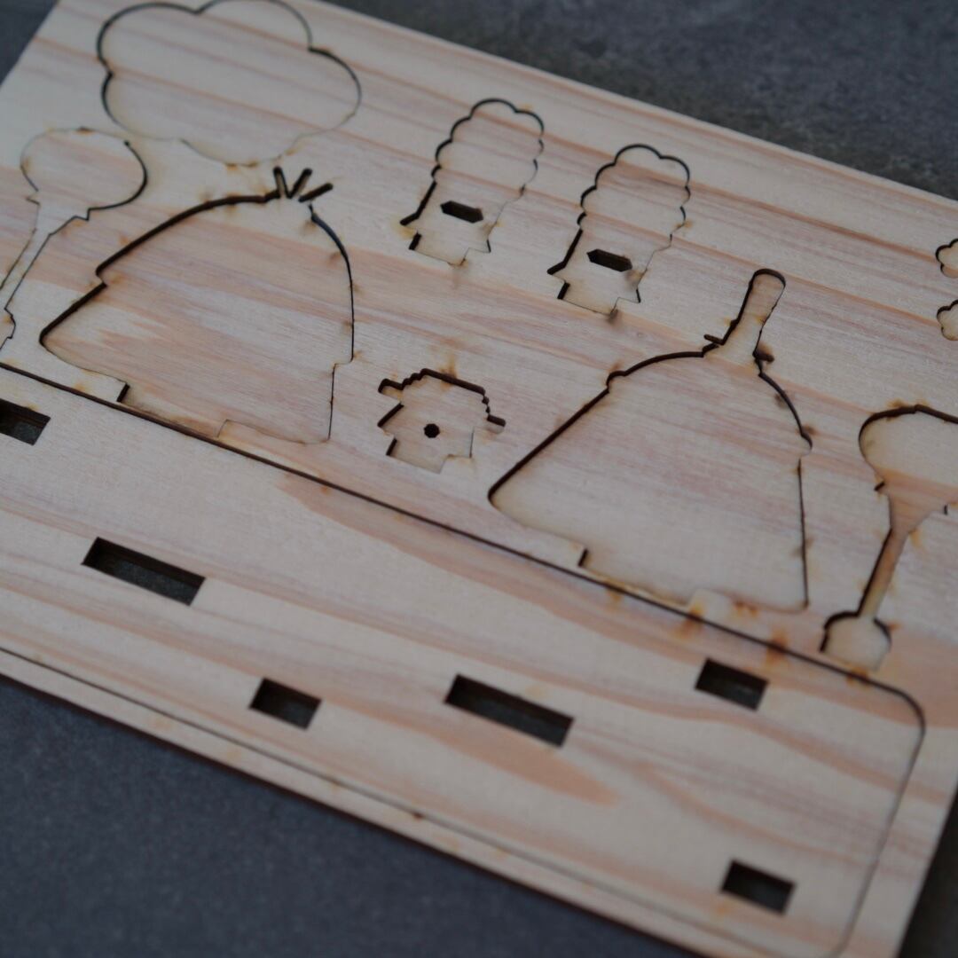 長崎県産の杉板をレーザー加工機にてカットして製作しております。